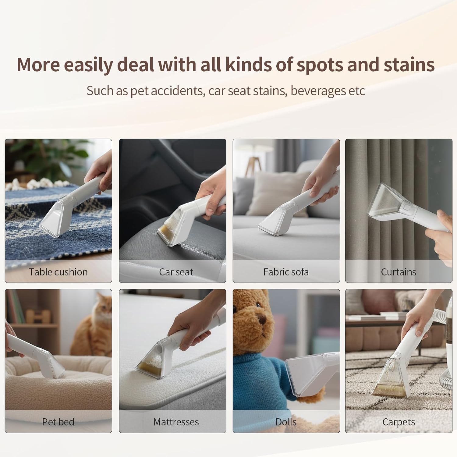 - 【WIDE APPLICATION RANGE】: The carpet cleaner machine is for fabric cleaning, and cleans most fabric products that cannot be cleaned as a whole, such as sofa, mattresses,car seat,and other difficult to clean items,and is equipped with two sizes of brush heads, which can be used for different areas of stains and can perfectly handle leaks and accidents for you.For more product details, please read the product manual carefully.we will be responsible for any product quality problems, please contact us actively.