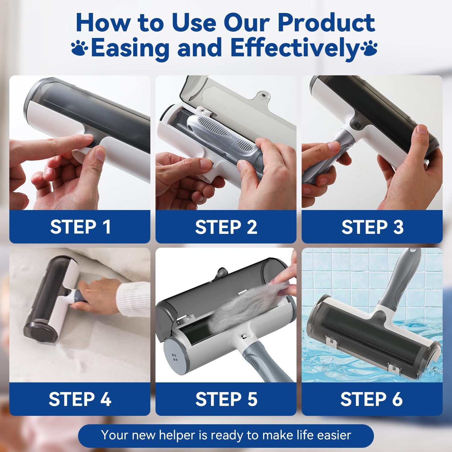 - Self-Cleaning Fur Bin β No sticky tape, no mess, no refills. Simply roll back and forth, and the built-in receptacle collects all the pet hair. One press of the button opens the bin for quick and easy emptying.