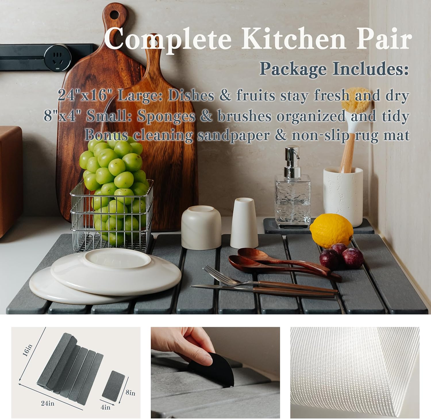 2pcs Stone Dish Drying Mat for Kitchen Counter, Quick-Dry Diatomaceous Earth Water Absorbent Pad & Countertop Drainer, Home Essentials for Bath and Pets - Dark Grey, 24x16’’ & 8x4’’