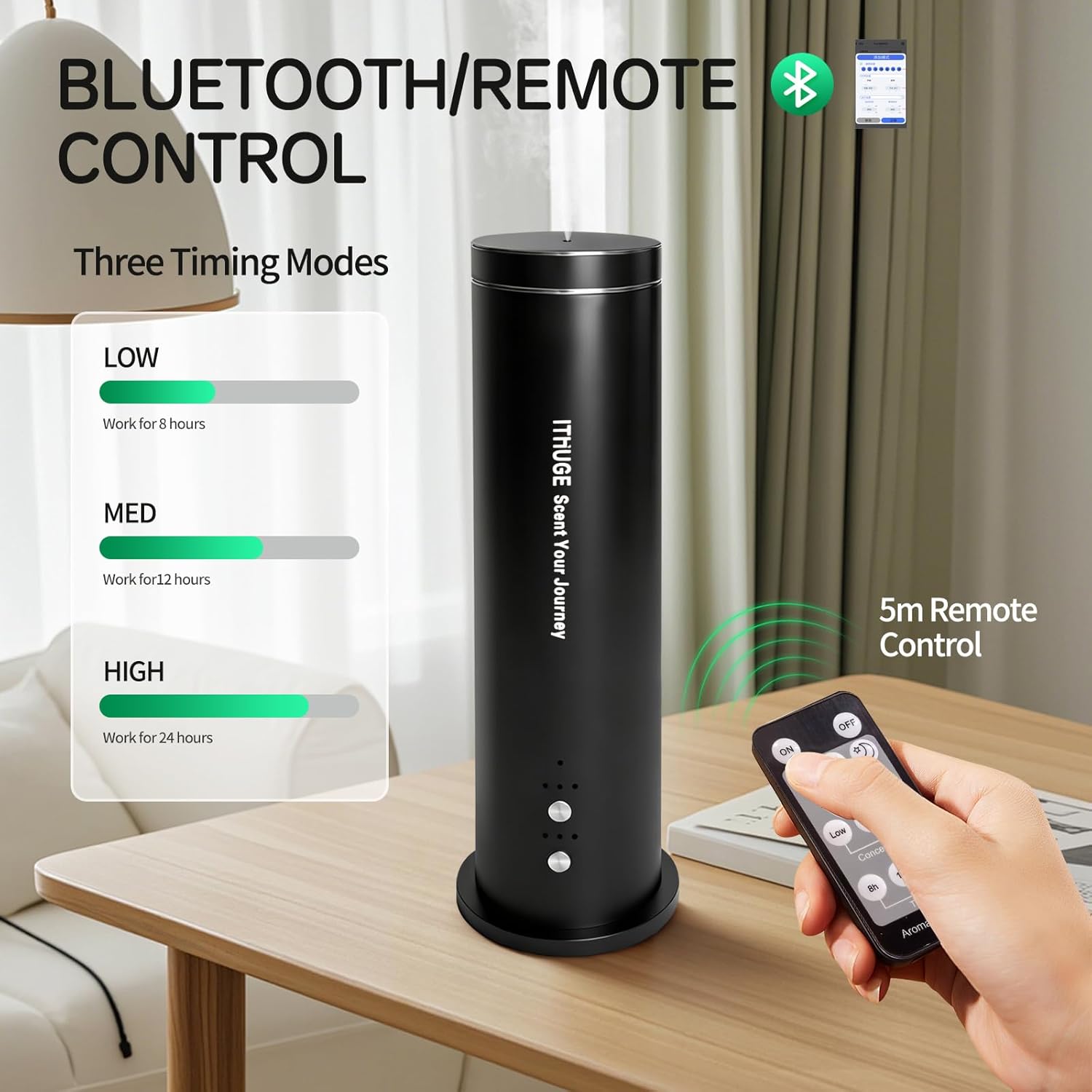 - 【Smart Timers & Controls】Customize your aromatherapy with adjustable mist levels (Low, Medium, or High) and flexible run times: 8, 12, 24 hours, or Continuous Mode — where the timer will no longer appear on the screen. The included remote and memory function restore your last-used settings after any interruption, making this oil diffuser for home a refined aroma diffuser starter kit for modern living